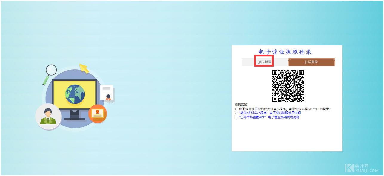 使用电子营业执照登录方式的---选择插卡登录---插上电子营业执照连接电脑,即可登录。或者使用电子营业执照APP 扫码登录,此种方式使用比较少,不再赘述。