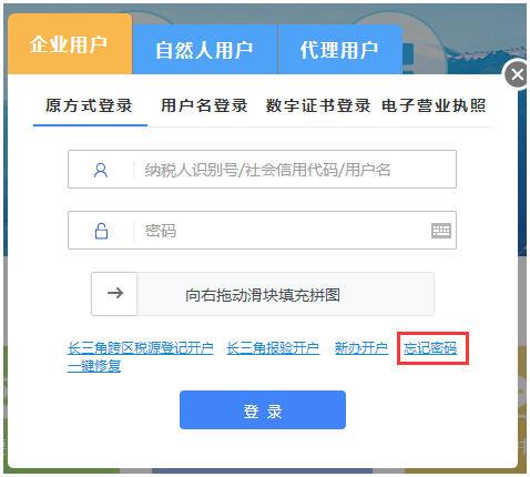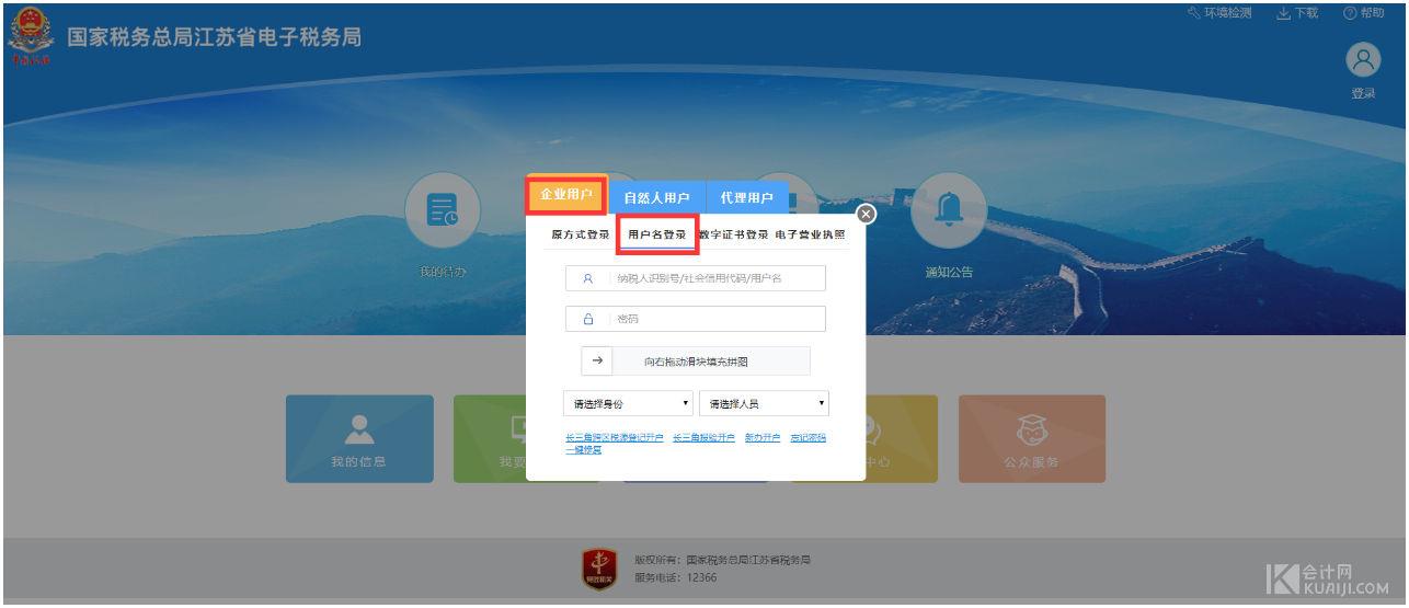 点击用户名登录----输入企业的税号----密码-----向右拖拼图----选择身份----选择人员---输入短信验证码验证---登录。